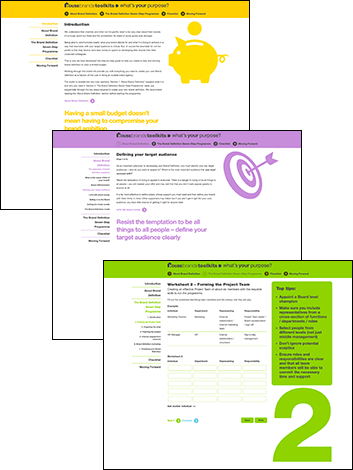 The ‘how to’ guide to creating your own brand definition in-house. This section covers the programme, taking each step in turn, explaining what tasks need to be done and how to complete them. To help you, worksheets, templates and tips are provided with each step.